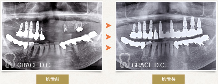 | 主訴・治療内容 | 左上3・6番の抜歯を行い、即時にインプラント埋入し、右上1番から左上7番までをインプラント補綴で治した症例です。 抜歯と同時にインプラントを入れることで、手術の外科処置が一回の手術回数で済むため、患者様の負担が軽減します。 また、抜歯直後は、生体の治癒力が活発に働くため傷口の回復が早いなどがあります。 もともと入れ歯を使用していましたが、インプラントにしたことによって、しっかりと噛めることで、胃や腸などへの負担も少なくなります。 |