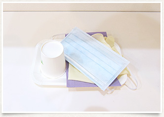 直接触れるグローブ、エプロン、コップ、さらにペーパートレーを導入し、必ず患者様ごとに使い捨てのディスポーザブルタイプを使用いたします。